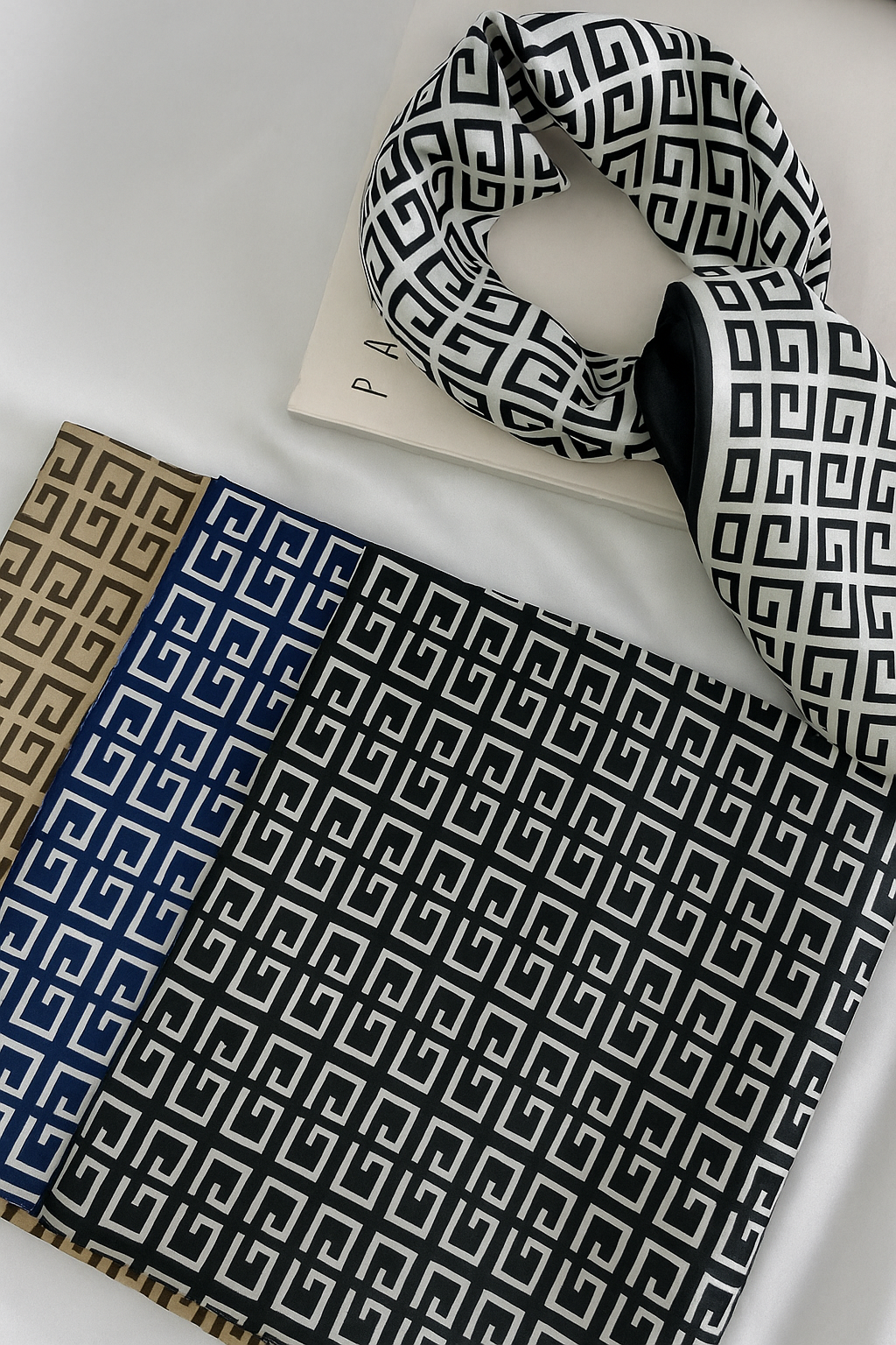 Lenço Atenas traz a elegância da estampa geométrica inspirada na Grécia clássica. Confeccionado em cetim leve e macio, possui brilho delicado e toque sedoso, garantindo conforto e versatilidade. Pode ser usado no pescoço, no cabelo, amarrado à bolsa ou como detalhe no look, adicionando um charme refinado em qualquer ocasião.