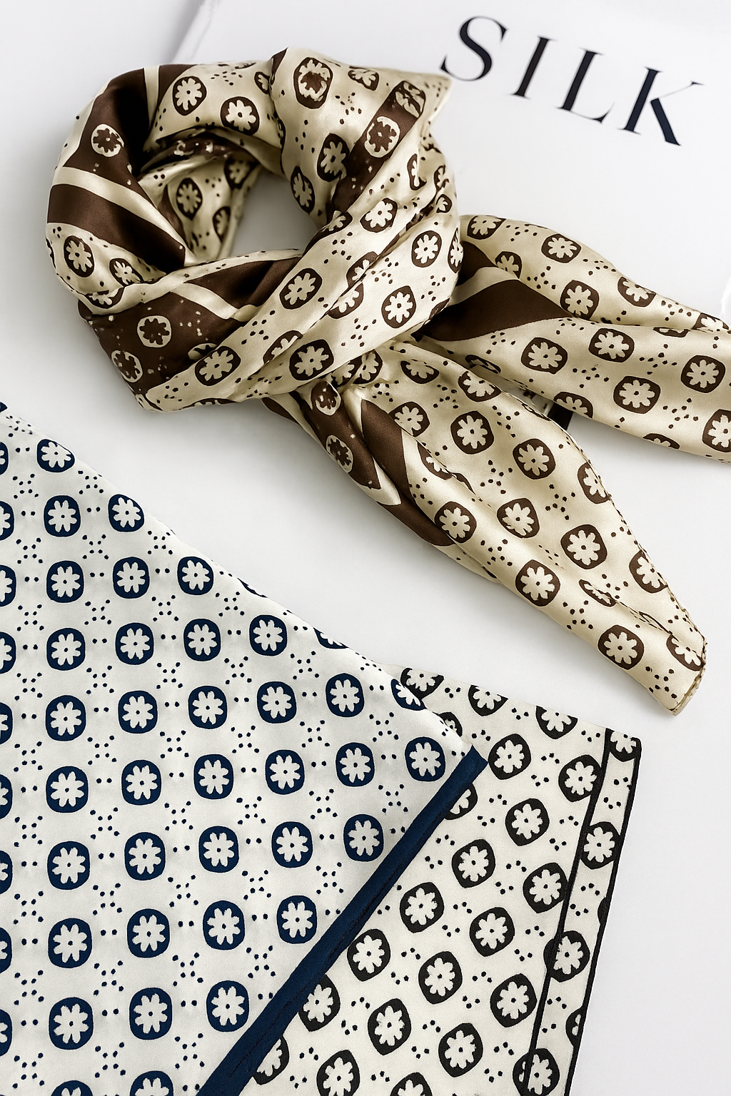 Com inspiração retrô e um charme atemporal, o Lenço Capri é feito em cetim leve e macio, com brilho delicado que realça qualquer look. Sua estampa com flores geométricas traz um ar sofisticado e versátil, perfeito para usar no pescoço, no cabelo, como faixa ou até amarrado na bolsa. Um acessório que transforma o simples em elegante com um toque mediterrâneo.